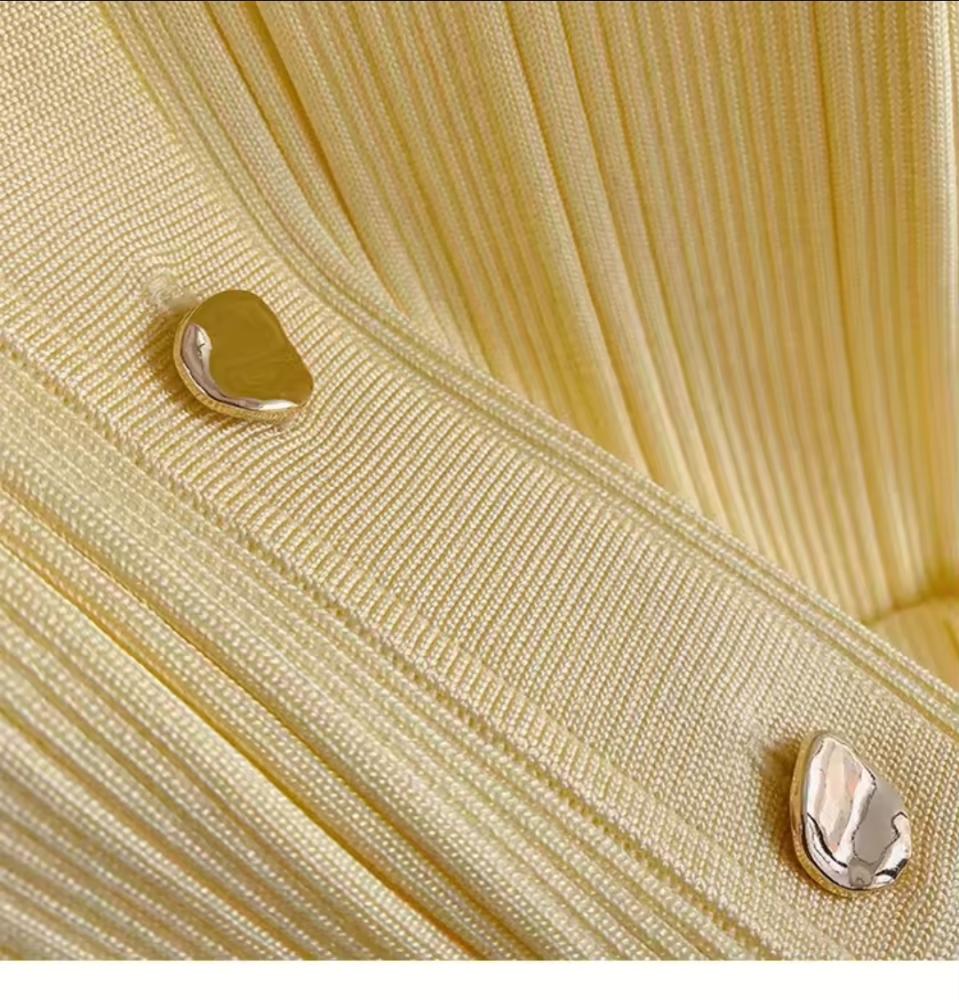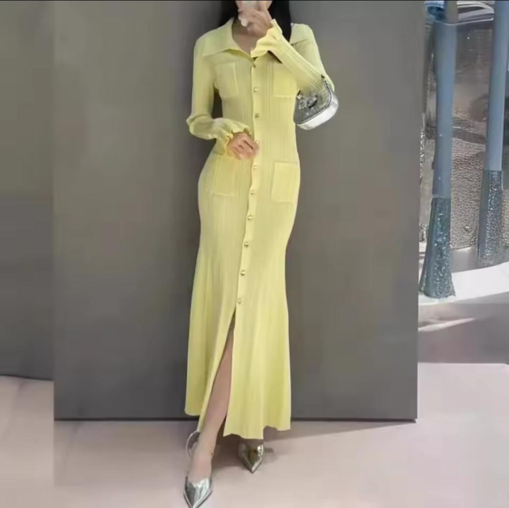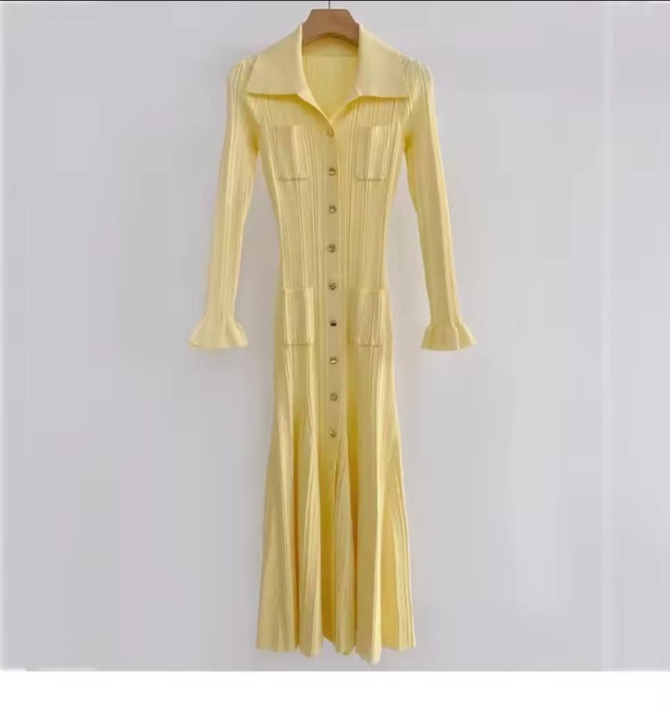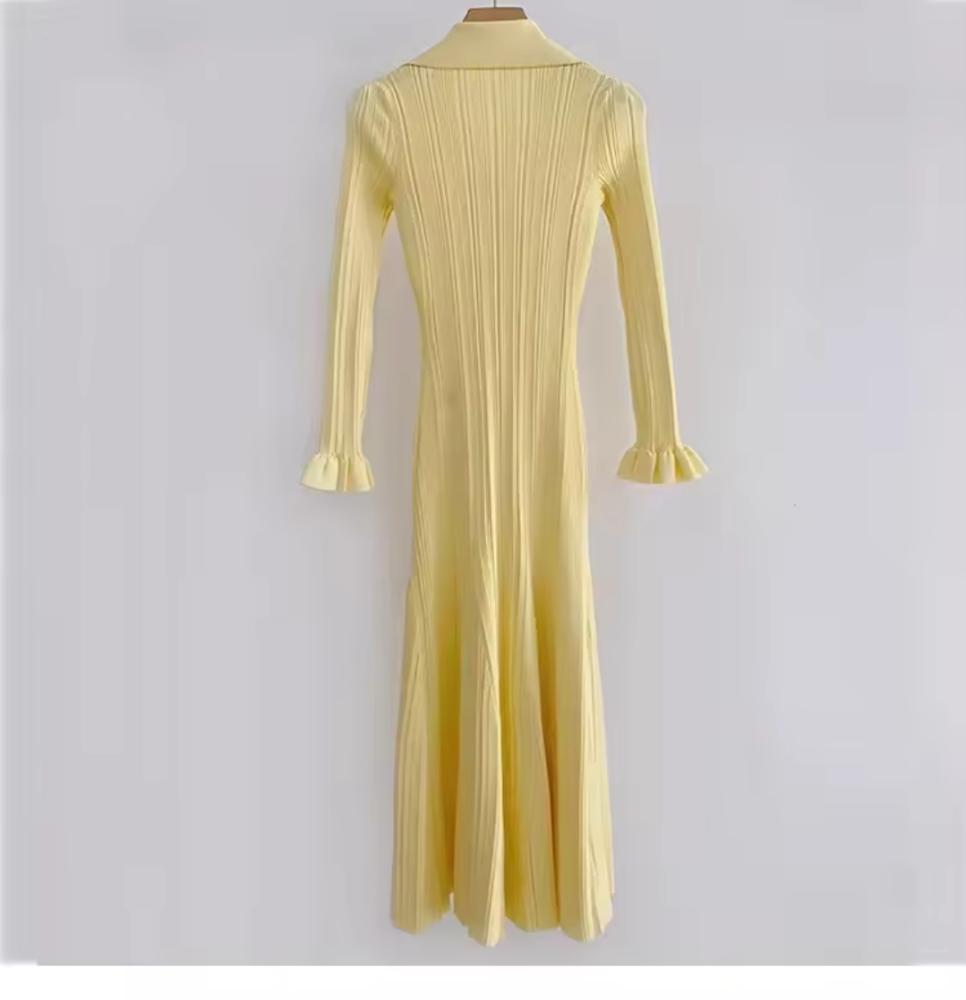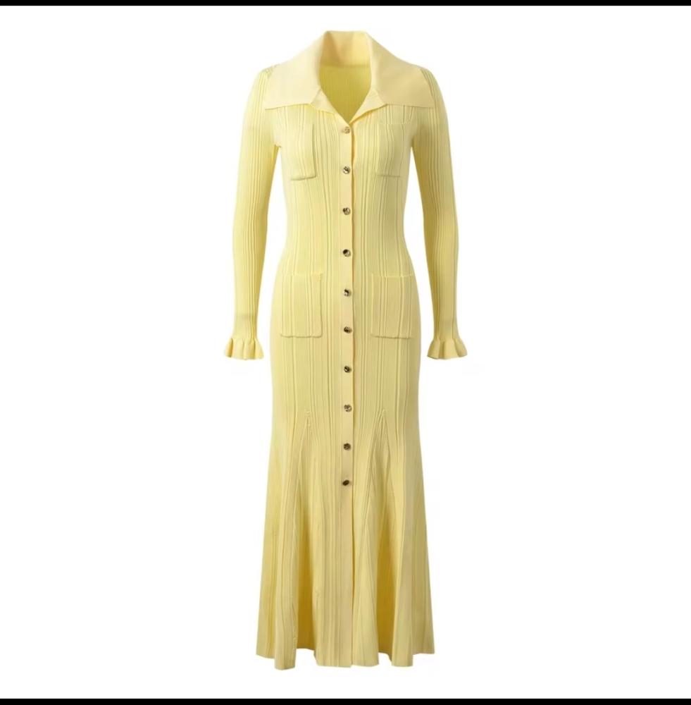 فستان صيفي وربيعي محبوك باللون الاصفر الكريمي