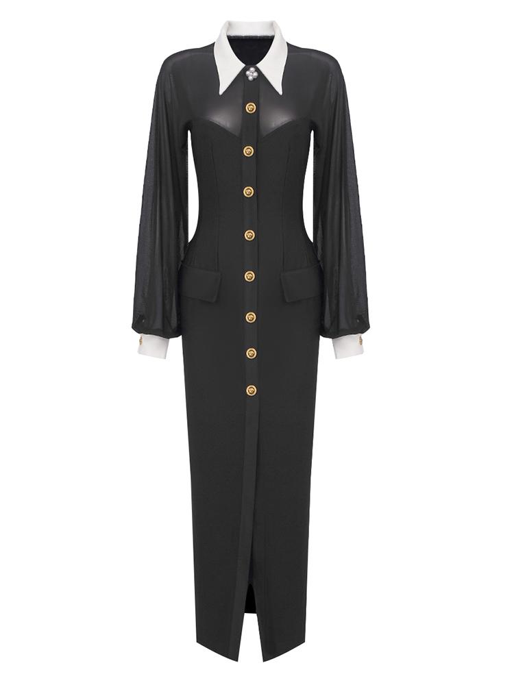 فستان اسود طويل ضيق اكمام طويله وفتحه عاليه