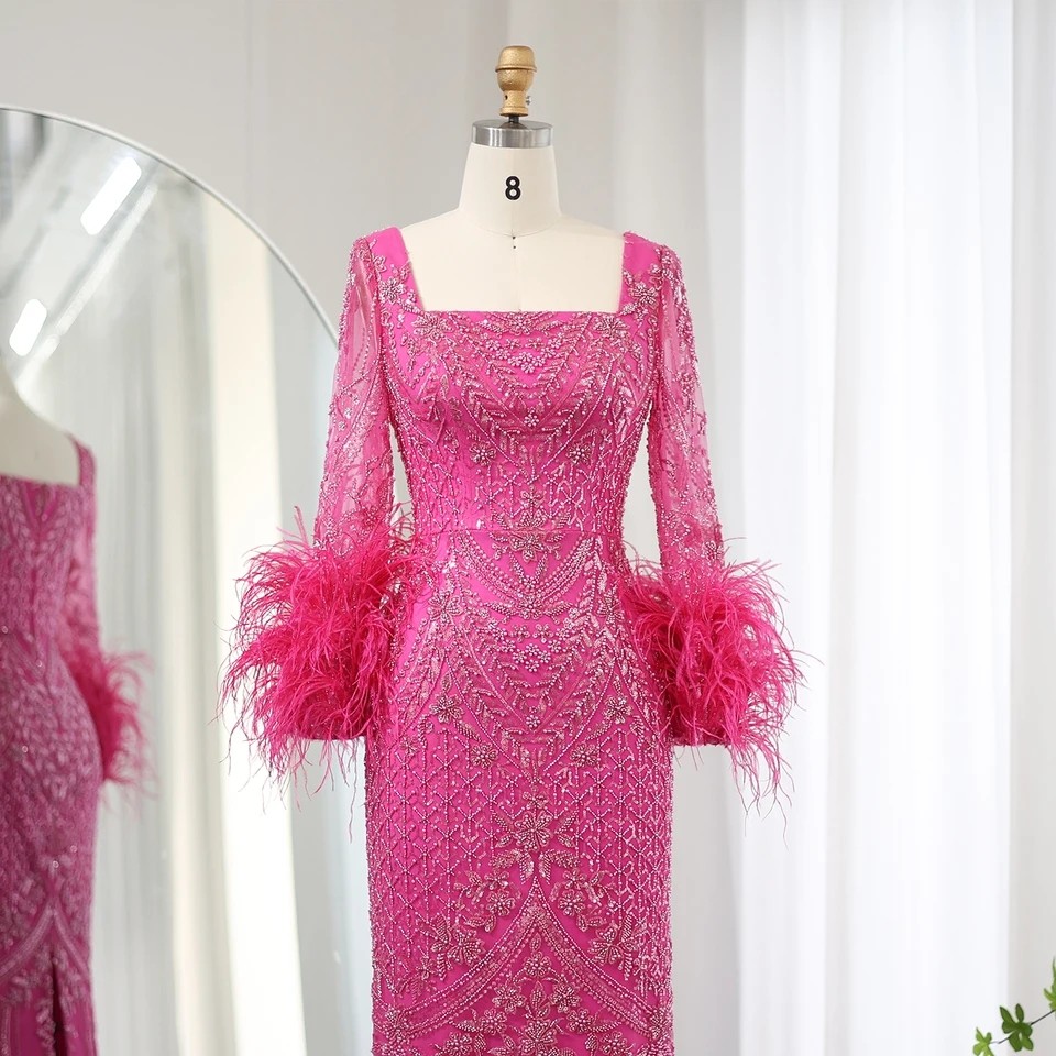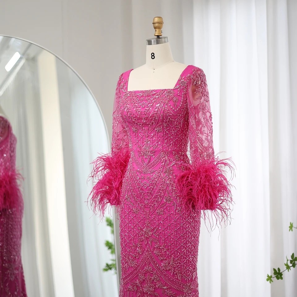 فستان فوشي مطرز فاخر بااكمام من الريش ..صور حقيقيه ١٠٠%